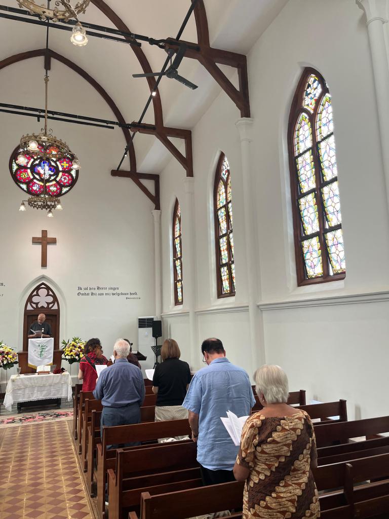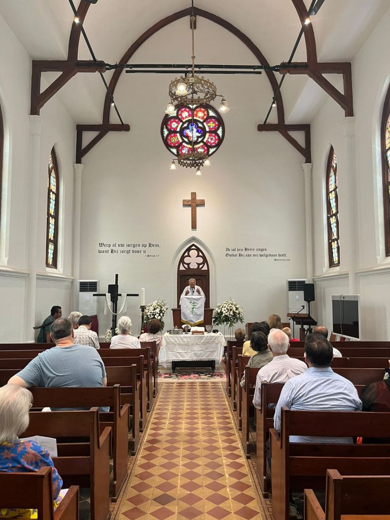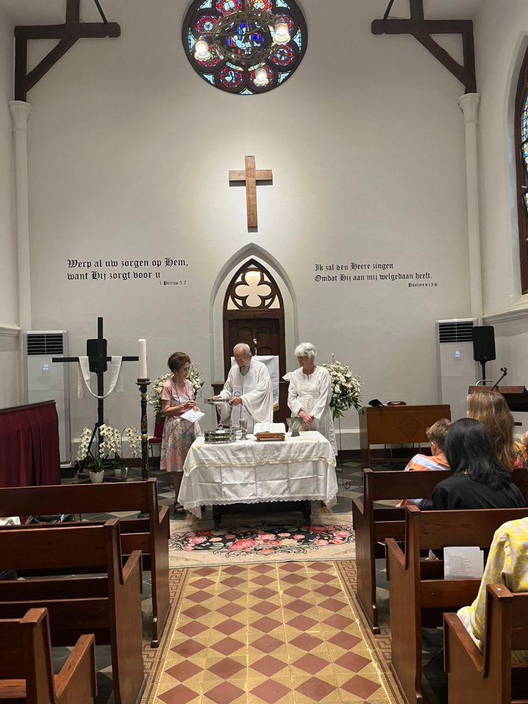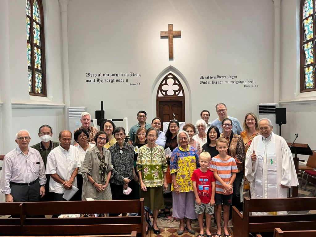 Paaszondag 31 maart 2024. Een heuglijke dag. Immers op Paaszondag 2023 was het de eerste keer, dat er na de Covid periode weer een Nederlandse kerkdienst in Jakarta werd gehouden. We zijn een jaar verder en gelukkig werd er door de inzet van een aantal werkgroepleden iedere maand een dienst georganiseerd. Ondertussen is ook de kapel nu mooi gerestaureerd. Het aantal bezoekers is in het afgelopen jaar geleidelijk aan toegenomen. Wel is de financiering nog een blijvend zorgenkindje. We zoeken nog naar behulpzame personen en creatieve oplossingen voor dat probleem. Ook zijn we blij, dat er elke maand weer een predikant bereid is om in onze dienst voor te gaan en dominee Ari, die de dienst na de onze leidt, begeleidt op de piano trouw ieder maand op uitstekende wijze de gemeentezang. Een aantal mensen van de kapel zorgt, dat alles logistiek naar wens verloopt.